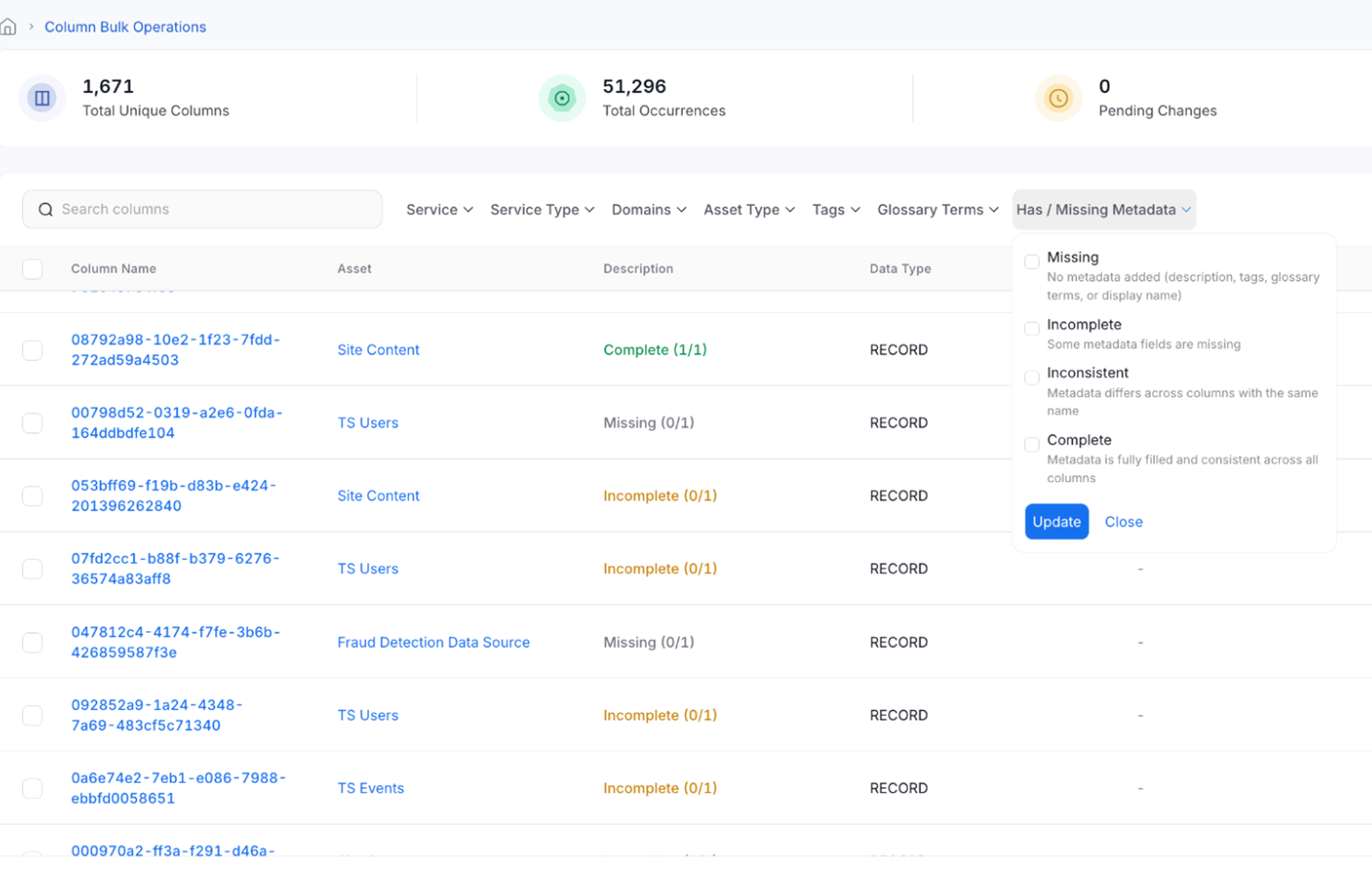 Column Bulk Operations aggregates identical column names across all asset types for unified governance at scale.