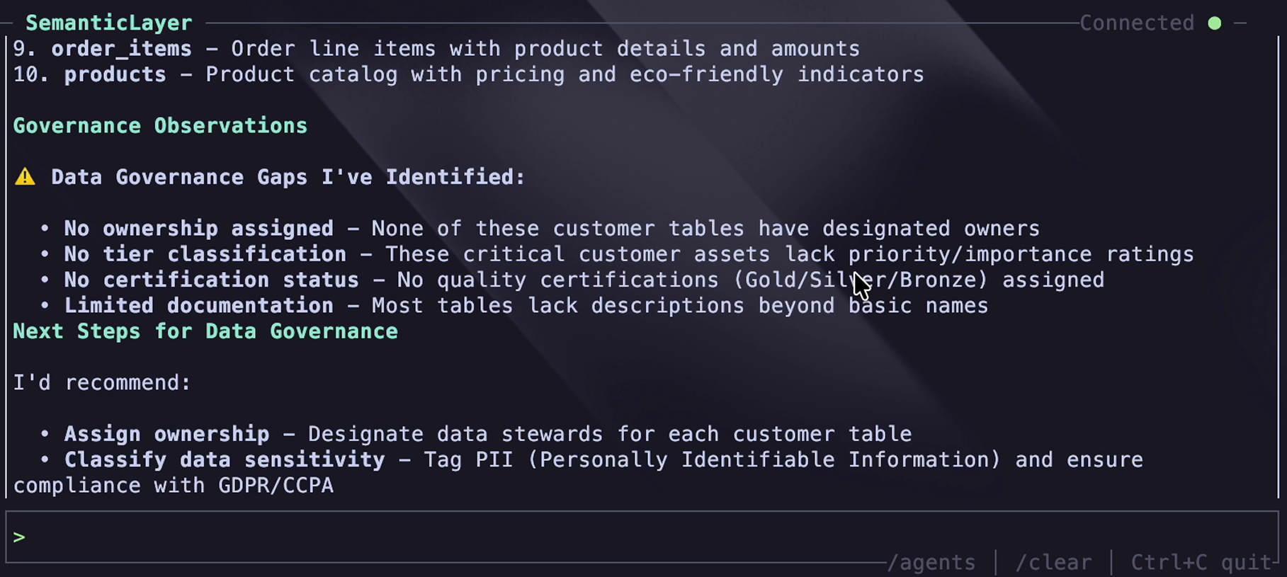 • Build on Collate's Semantic Metadata Graph: Access lineage, quality metrics, ownership, and business meaning through a simple API, eliminating the need to reconstruct this complex knowledge graph yourself.