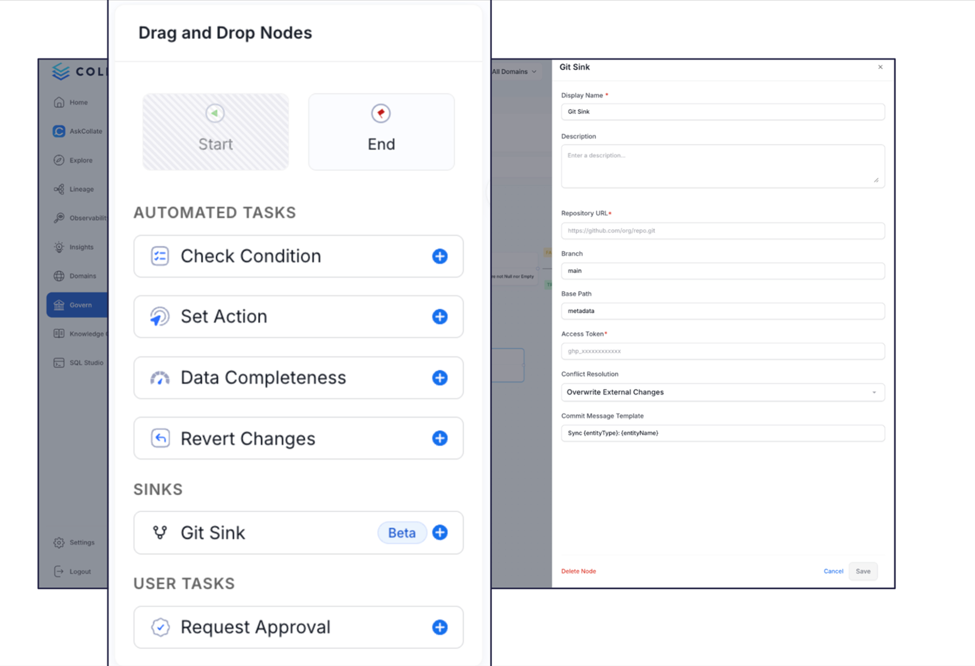 • Automated Git commits: Send metadata changes to GitHub repositories automatically as they occur in Collate. Every description update, tag addition, or glossary term creates a versioned commit.
