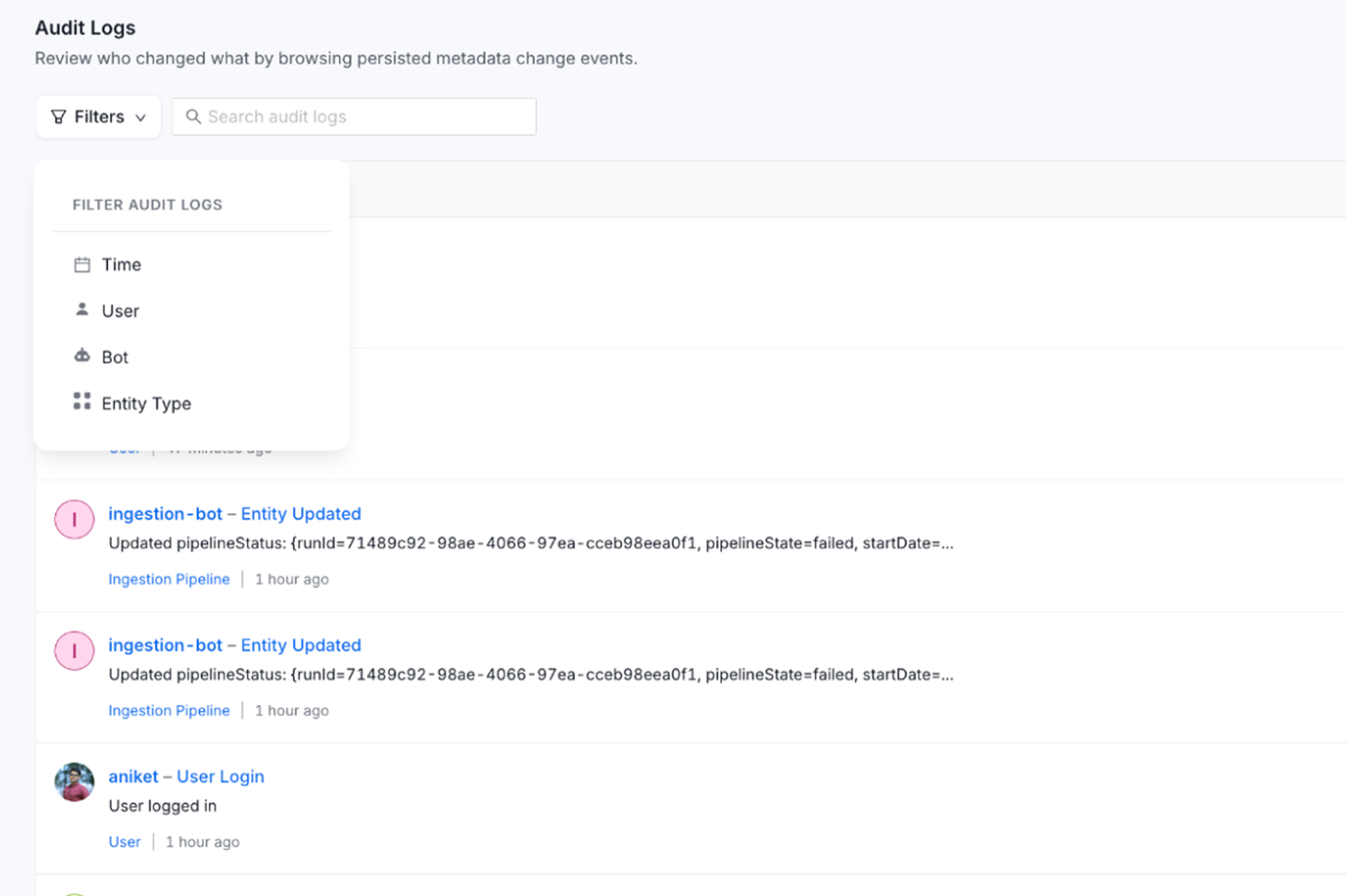 Why this matters: As AI agents increasingly make automated changes to metadata in partnership with human data teams, organizations need accountability and traceability. Audit logs provide the transparency enterprises require, letting you audit what agents and users have done.