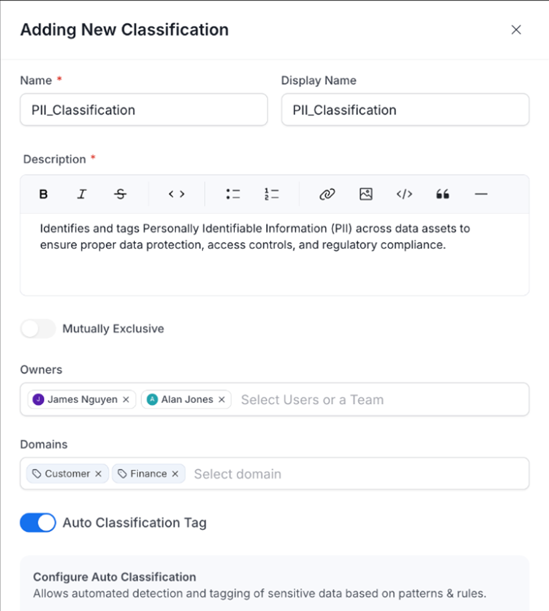 Auto Classification now lets you create custom AI-powered recognizers for any classification—not just PII—with a feedback loop that continuously improves accuracy. Organizations can teach Collate to identify company-specific data patterns using actual data content scanning, going far beyond the column-name-only approaches from other vendors.