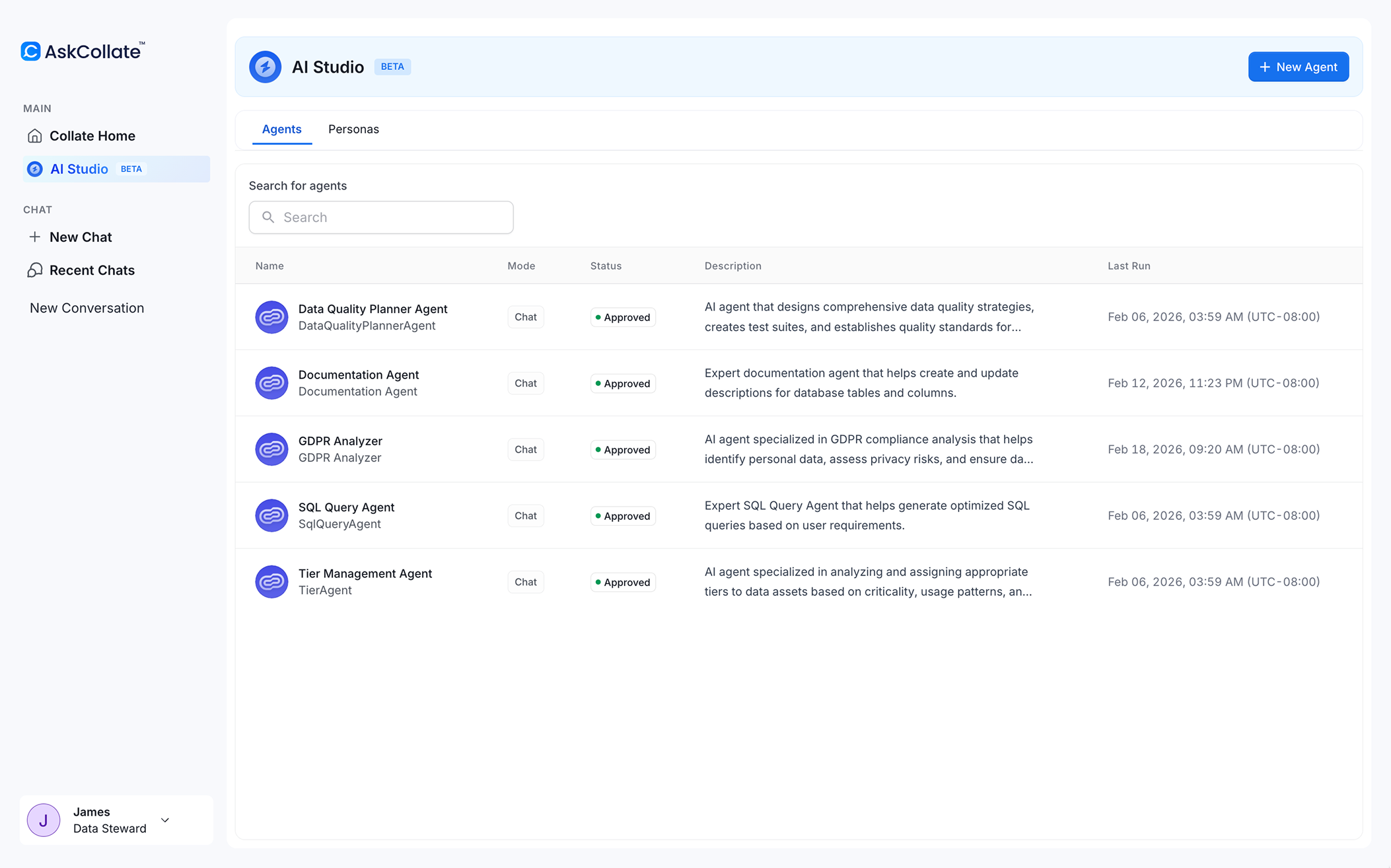 Collate AI Studio lets you customize existing AI agents and create new ones to manage your data landscape. Adapt how Collate's native agents behave, or create purpose-built agents that understand your organization’s unique knowledge graph—all through an intuitive interface that lets you adapt agents to your team’s specific needs. To learn more, read the Collate AI Studio launch blog.